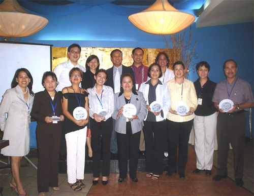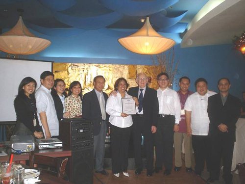 | Together with E+S executives, the GMM's display their “Commitment Plates” (front row, from left): Lally de Castro, Mitch Espinosa from Netherlands, Noemi Cruz from USA, SSen Ota from Japan, Delia Wallwork from USA, Nheng Potente from London & Spain, Bernadette Fillart & Odette Perlada of USA & Chuck Bough from USA (back row, from left) Mr. Jacinto Ng, Jr., Dennis Lim and Mrs. Elkin from France.