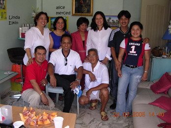 ESC Global Sales Manager in London Felipa Lee (5th from left) in LIC freight forwarding office in Askew Road. Ms. Lee also uses the same office to promote and sell ESC. With her in the picture are Pam Davila-Pascual, Ramon Siopongco, PLDT Get Smart UK Lally De Castro and Bernadette Bisdee. |