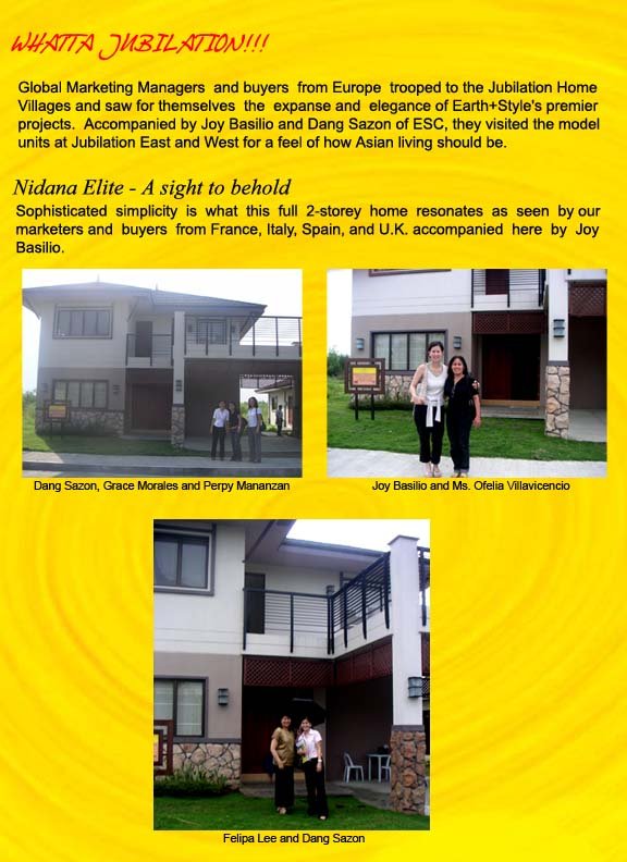 It’s now time to count the blessings…yes indeed, Earth+Style operations in the Netherlands has no way to go but UP!!! How could this be possible considering that we have just started our operations in just six, yes, six months ago? It could not be true, but yes, it is! Joy Tan-Basilio, Global Network Consultant and I love to look back at how we officially started in February 2005… from the time we first set-up our display booth at the Philippine National Bank in Amsterdam… to the series of road shows and open houses that we have done… to the opening of Earth+Style office in Doorn… to our participation during the Philippine Independence Day Celebration in Spaarnwoude. And speaking of road shows and open houses, we are glad to note that as of this writing, the calendar of activities of the International Program Organization of Earth+Style Corporation is fully booked due to numerous requests from interest parties all over Europe for site trippings… you read it right…. EUROPE! Yes, Earth+Style is flying high in Europe… France, Netherlands, Spain, Italy, United Kingdom…. And Earth+Style Family in Europe is growing & expanding to be able to reach the Filipino communities in Europe. EARTH+ STYLE ………. THEIR CHOICE Our Choice….As a Dutch-Filipino married couple of almost 25 years, we were looking for an affordable place to retire and for sure it would be in the Philippines. It's reputation of hospitality, friendly people, relaxed atmosphere, available medical assistance at reasonable fees were a plus too. Jubilation New Biñan is well located in Laguna and NAIA, Manila, Tagaytay, Alabang can be easily reached. The detailed information given by the Earth+Style office in Doorn and the variety of excellent well edited brochures, the efforts taken to give us any information and assistance we asked for, made us decide to buy a lot in New Biñan to build a bungalow. During the whole process, communication with Doorn office and Manila HQ was excellent. That's why Nene & I are looking forward to our retirement in 2010.